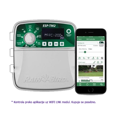 Programator za unutrašnju ugradnju. Radi na 220V. Modeli sa 4, 6, 8 ili 12 izlaza za elektro ventile (24V AC). Ima izlaz za senzor za kišu i komandu pumpe. Postoji mogućnost kontrole preko mobilne aplikacije uz ugradnju WIFI LNK. Potreban je wifi signal na mestu gde se programator nalazi.